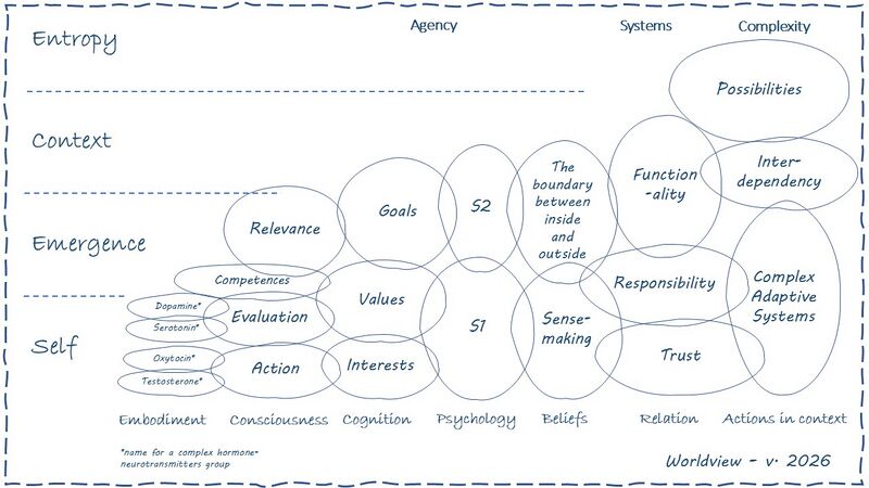 All the above is not linear, but is situated in a multi-dimensional space. The open frame of the worldview model represents the dimensional space of action, evaluation and potention we live in.